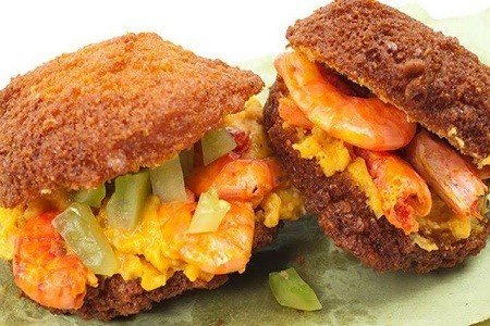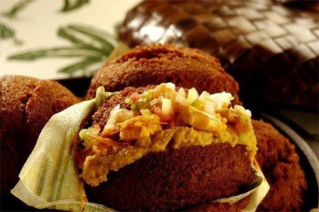 Recheio com vatapá, camarão seco, caruru e salada